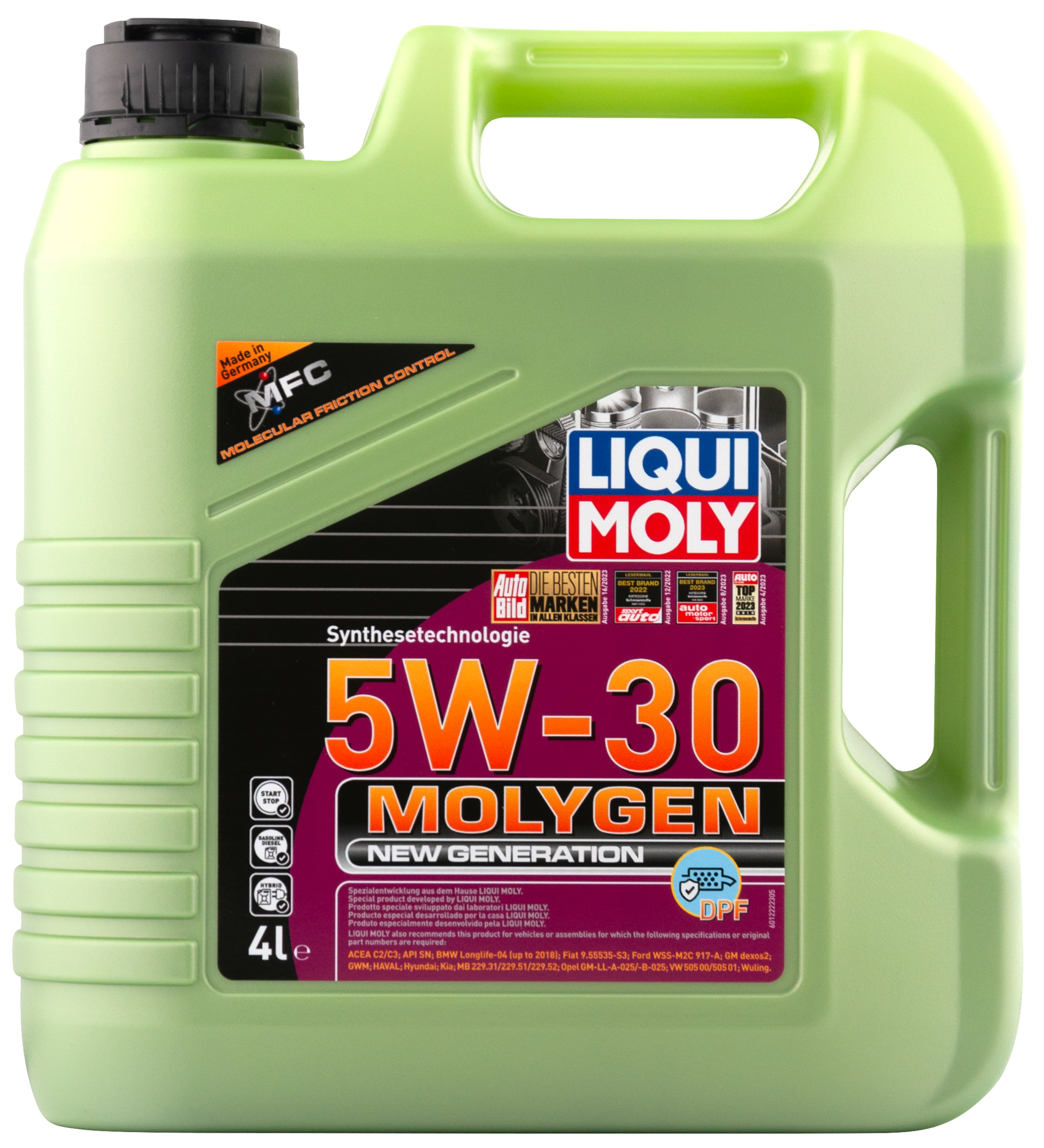 •Комбинация самых современных базовых масел и новейшего уникального пакета присадок Molygen, созданного на основе гибридной технологии MFC, обеспечивает моторному маслу непревзойденные защитные свойства. Технология MFC (Molecular Friction Control) работает посредством легирования поверхностного слоя деталей двигателя ионами молибдена и вольфрама. В результате легированные поверхности обладают очень высоким запасом прочности, который сохраняется на долгий срок. - легкий ход двигателя - наивысшая защита от износа - обеспечивает длительный срок службы двигателю - снижает расход топлива - быстрая подача масла при низких температурах - устойчиво к старению - оптимальное давление масла при всех рабочих режимах - особенно подходит для автомобилей с сажевым фильтром - испытано с турбонаддувом и катализаторами" Моторное масло Molygen NG 5W-30 DPF благодаря новейшей формуле MFC позволяет существенно увеличить ресурс двигателя и сажевого фильтра. Технология снижения трения позволяет снизить расход топлива.