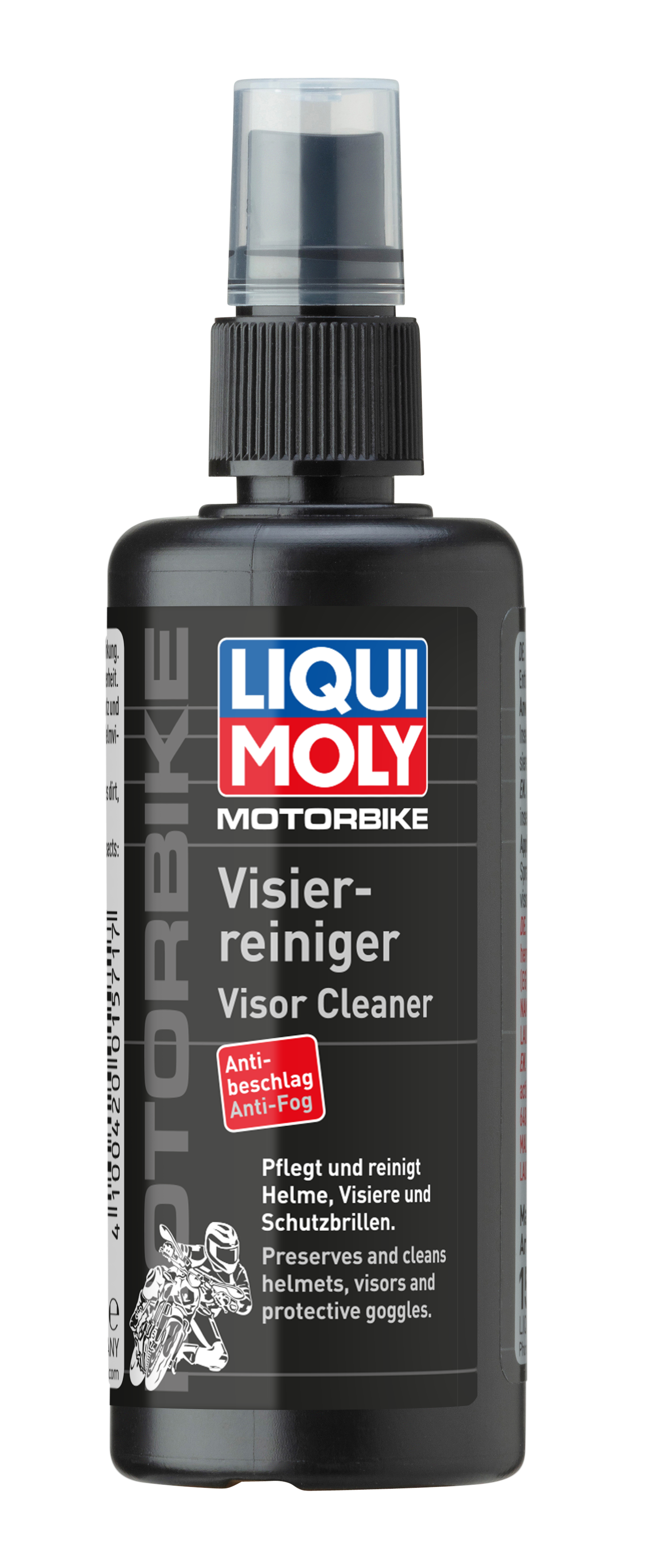 Очищает забрала мотошлемов и создаёт покрытие, препятствующее запотеванию. Удаляет пыль, грязь, жиры, силиконы и остатки насекомых с забрал из любых полимерных материалов: поликарбоната, полиметилметакрилата, полистирола и т.п. Не оставляет мутной пленки после высыхания, не повреждает обрабатываемые материалы. В 2021 году Европейский мотоциклетный журнал "Motorrad" провёл испытания очистителей шлемов. Продукт LIQUI MOLY Motorbike Visier-Reiniger стал победителем, показав лучший результат по итогам тестов.